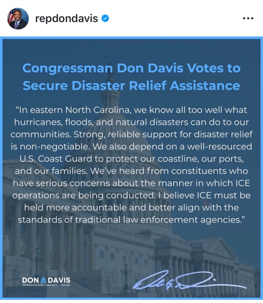 In an Instagram post, Davis said eastern NC also relies on a strong Coast Guard, another unit under DHS control.